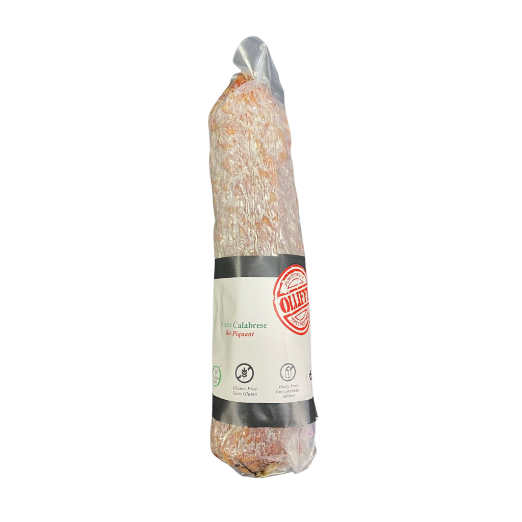 Calabrese Salame Hot is a bold, dry-cured Italian salami that brings just the right amount of heat to every bite. Packed with savoury depth and a spicy kick, this handcrafted salame is a must-have for any charcuterie board. Its rich flavour pairs perfectly with aged cheeses, crusty bread, and briny accompaniments, making it a standout addition to any gathering.