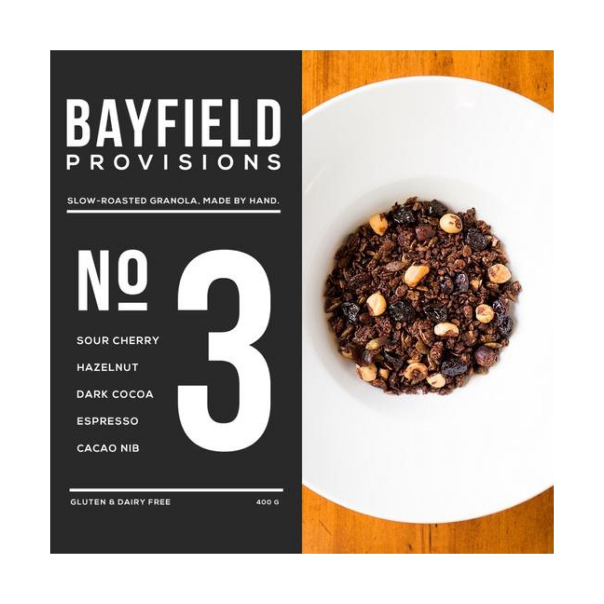 Bayfield Granola No. 3 is a decadent blend of dark Dutch cocoa, bold espresso, and nutty cacao nibs, perfectly balanced with dried sour cherries and chunks of toasted hazelnut. Rich and indulgent, this handcrafted granola delivers deep, chocolatey notes with a satisfying crunch, making it an exquisite pairing for yogurt, milk, or as a sophisticated snack straight from the bag.