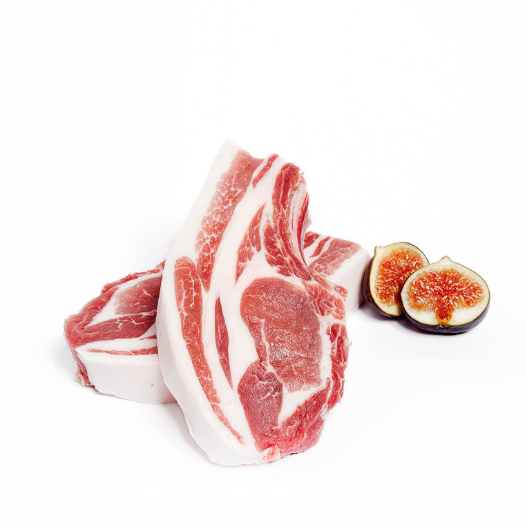 Cut from the rib section of the loin, this chop is known for its superior marbling and juicy tenderness. The bone not only enhances the flavour but also provides a stunning visual presentation, making it ideal for gourmet dinners or special occasions.
